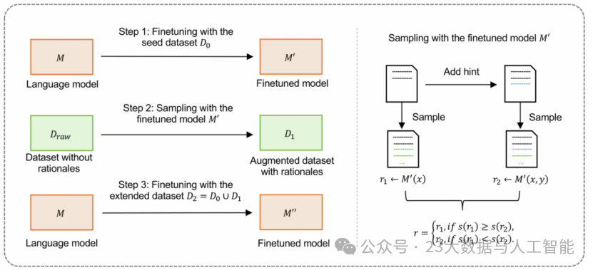 如图2所示,研究者首先构建了包含 800 条人工标注诊断推理示例的小规模数据集D0,这些示例均由专业医生针对特定病例撰写,详细拆解了诊断过程中的推理步骤;随后,研究者以这 800 条初始标注数据为训练样本,对预训练模型 MedFound 开展微调,得到具备初步诊断推理能力的模型 M'。