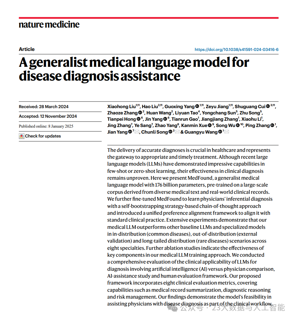 本期分享的是北京邮电大学的王光宇研究团队于2025年发表在Nature Medicine上的论文:《A generalist medical language model for disease diagnosis assistance》。该研究提出了当前已知参数规模最大的开源医学语言模型 MedFound (176B),并在此基础上构建了通用医学诊断大语言模型MedFound-DX-PA。该模型展现出与临床专家相媲美的医学知识储备及诊断推理能力,能够为多种临床场景下的疾病诊断提供高效、准确的辅助支持。