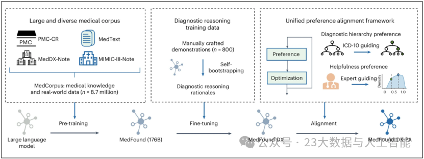 本文提出了一款名为MedFound-DX-PA的医疗诊断专用大语言模型,通过大规模医学文本与真实临床记录进行预训练,并采用自举式思维链微调策略学习医师诊断推理过程,结合基于ICD-10层级结构与专家标注的统一偏好对齐框架,显著提升了模型在常见病、分布外泛化及罕见病诊断任务中的性能。该模型在八大学科领域中均优于现有基线模型与专用系统,并通过与医师对比研究、AI辅助诊断实验及CLEVER人类评估框架验证了其在实际临床工作流程中的有效性与安全性,为AI辅助诊断提供了可靠且可解释的通用解决方案。