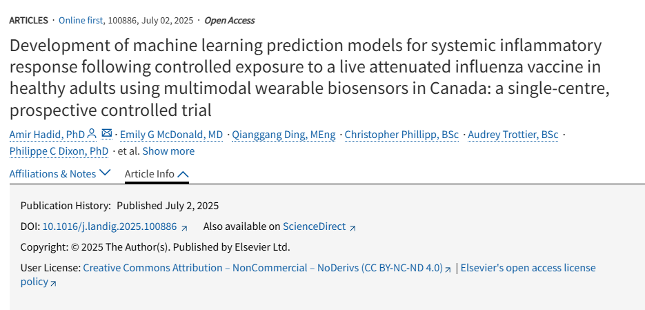 该研究题为《Development of machine learning prediction models for systemic inflammatory response following controlled exposure to a live attenuated influenza vaccine in healthy adults using multimodal wearable biosensors in Canada: a single-centre, prospective controlled trial》由Amir Hadid、Emily G McDonald、Qianggang Ding、Christopher Phillipp、Audrey Trottier、Philippe C Dixon、Oussama Jlassi、Matthew P Cheng、Jesse Papenburg、Michael Libman和Dennis Jensen等撰写,作者隶属于加拿大蒙特利尔麦吉尔大学教育学院运动机能学与呼吸生理学实验室、麦吉尔大学Sylvan Adams运动科学研究所、麦吉尔大学健康中心内科总医学科、魁北克人工智能研究所(Mila)、蒙特利尔大学计算机科学与运筹学系以及麦吉尔大学健康中心研究所。研究旨在开发基于多模态可穿戴生物传感器与机器学习的预测模型,用于实现健康成年人在接种减毒流感活疫苗(LAIV)后系统性炎症反应的早期预测,而无需依赖临床症状。该团队在加拿大蒙特利尔麦吉尔大学健康中心招募了56名18–59岁的健康志愿者,通过Oura指环、Biobeat手表和Astroskin–Hexoskin智能衬衫等设备持续监测心率、呼吸频率、加速度等生理数据,并结合高时间分辨率的血液炎症生物标志物进行分析。采用梯度提升机器学习算法(XGBoost)训练模型后,在实时预测和24小时容差预测窗口下的ROC-AUC分别达到0.73和0.89,显著优于仅基于症状的检测模型(ROC-AUC分别为0.66和0.79)。研究结果表明,融合系统性炎症生物标志物与可穿戴设备生理数据的机器学习模型,可实现对轻微流感感染引发的炎症反应的早期客观检测,有望推动病毒性呼吸道感染(包括无症状或亚临床阶段)的早期发现,为公共卫生干预和防控策略提供新的技术手段。