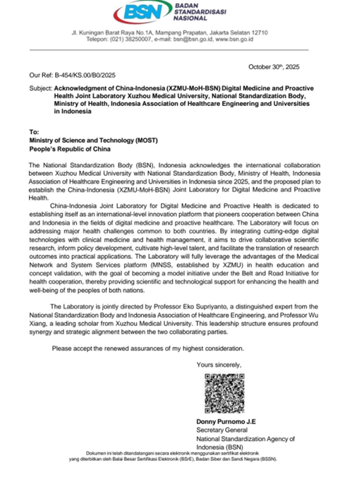 据印尼国家标准局官方函件确认,该联合实验室由印尼卫生部Eko Supriyanto教授与我院吴响教授联合指导,将聚焦两国共同面临的重大健康挑战,通过整合人工智能、大数据等前沿数字技术,开展临床医学与健康管理创新研究。其核心任务包括驱动协同科研、支撑政策制定、培育高端人才及促进成果转化,致力于成为“一带一路”倡议下健康合作的示范性举措。