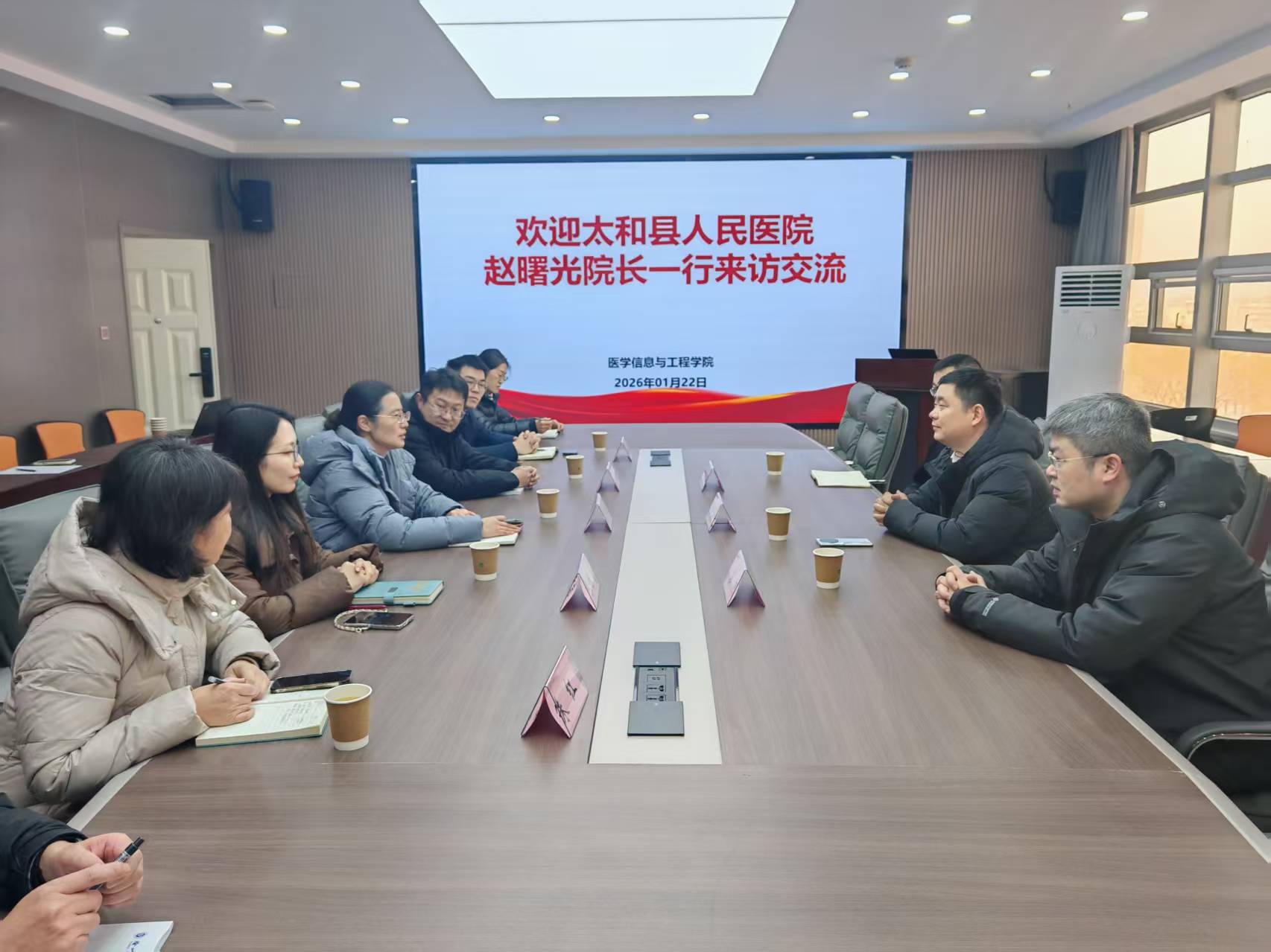 1 月 22 日上午,太和县人民医院党委副书记、院长赵曙光一行来访交流。学院党总支书记冯文静、副院长吴响、党总支副书记张姝、挂职副院长张然及软件工程教研室主任朱红参加座谈。