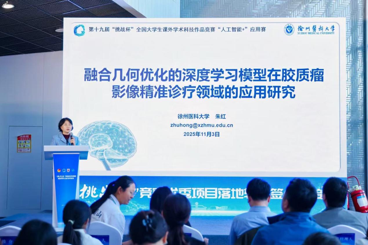 《融合几何优化的深度学习模型在胶质瘤影像智能诊疗领域的应用研究》项目应团省委邀约参加了“挑战杯”竞赛优秀项目落地转化签约对接会,项目指导老师朱红教授现场进行项目展示,并与苏大天宫创业投资管理有限公司签订了转化框架协议。