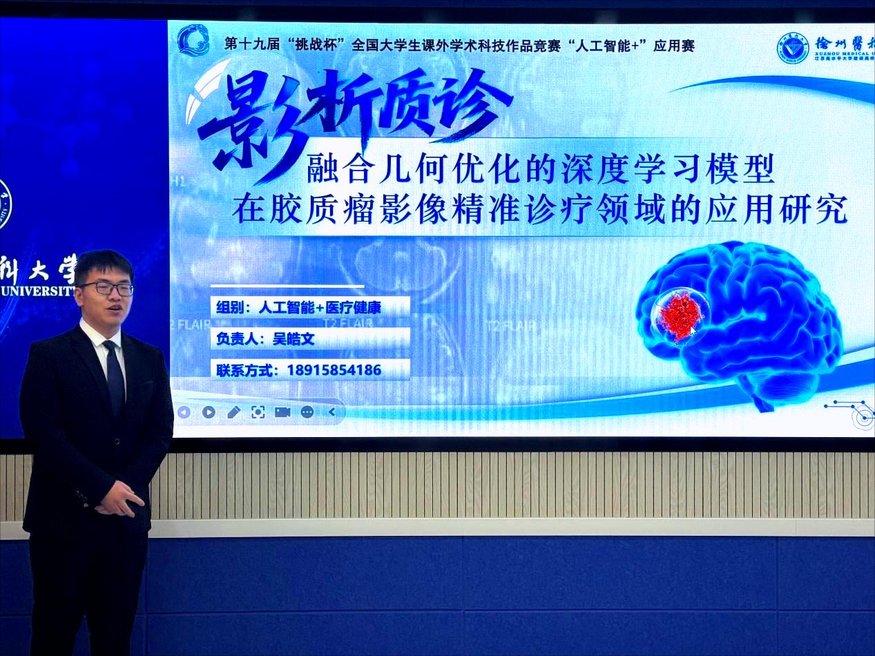 “挑战杯”国赛一等奖项目《融合几何优化的深度学习模型在胶质瘤影像精准诊疗领域的应用研究》负责人吴皓文同学进行了项目路演展示。该项目聚焦医学影像分析前沿领域,展现了医工交叉融合的创新优势,体现了学院学子扎实的专业功底和良好的舞台展示能力,赢得了与会师生的高度评价。