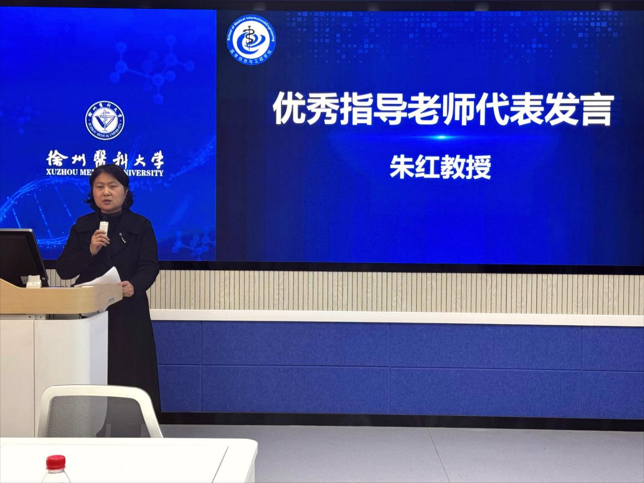 在交流发言环节,优秀指导教师代表朱红教授分享了指导学生参加科创竞赛的心得体会。她表示,国赛奖项的获得离不开团队成员的日夜钻研、师生间的协同攻关,更离不开学校、学院对科创工作的大力支持。她鼓励同学们立足学科前沿、扎根临床需求,保持对创新的热爱与执着,在实践中突破自我、锤炼本领。青年教师代表陈亚伟在发言中表示,将以优秀前辈为榜样,积极参与学生科创指导,为学院人才培养贡献力量。